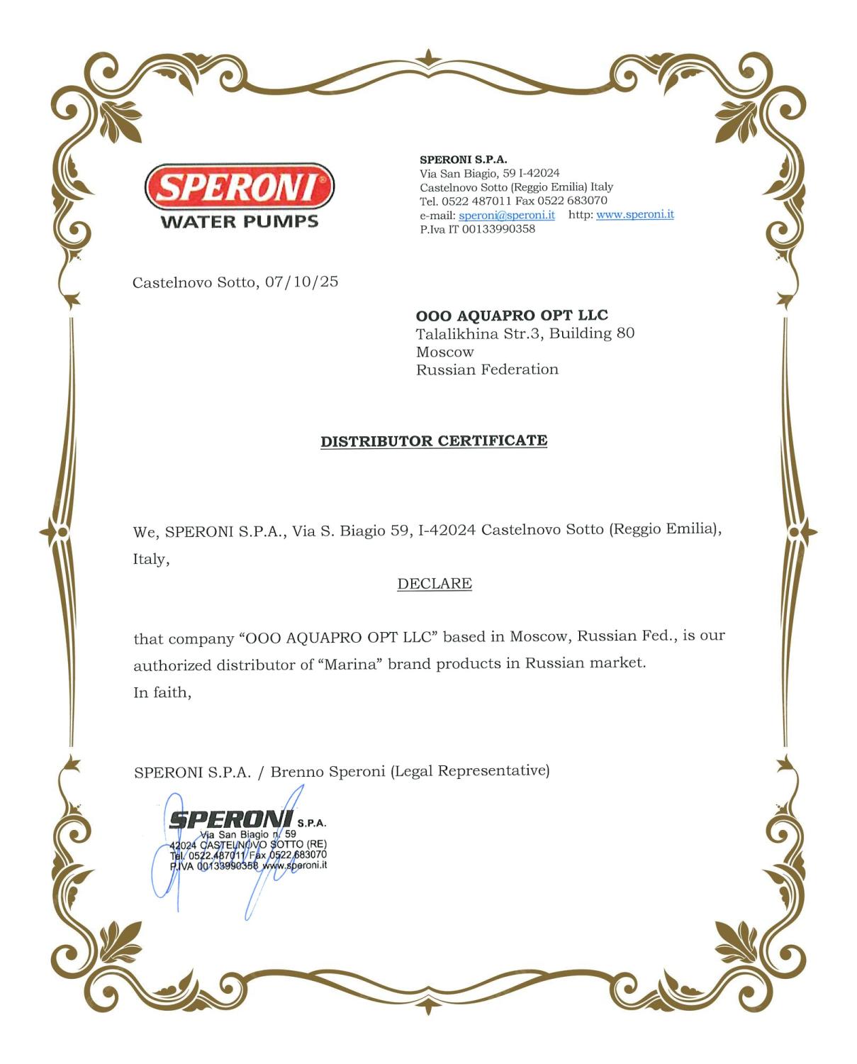 Сертификат об эксклюзивном дистрибьюторстве AQUAPRO